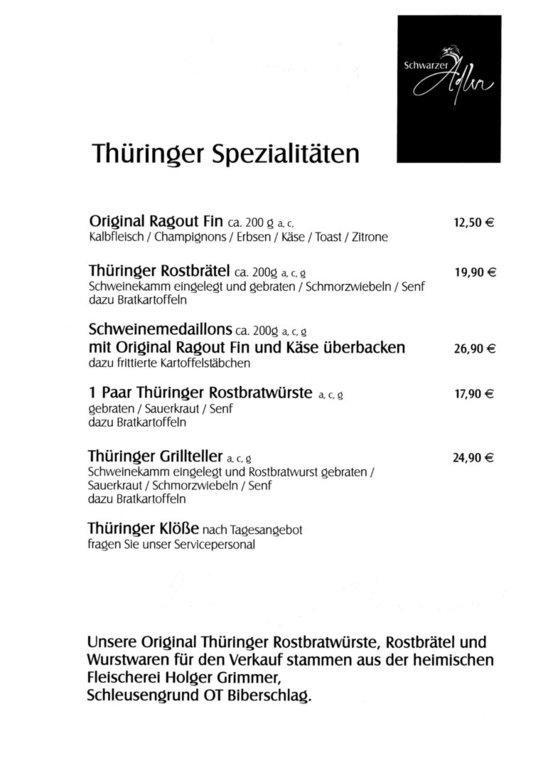 In unserem Restaurant verwöhnen wir Sie mit Thüringer Spezialitäten, darunter das Rostbrätel, die Thüringer Rostbratwurst und das original Ragout Fin vom Kalb . Darüber hinaus bieten wir eine Auswahl an regionalen und internationalen Gerichten, die stets aus frischen Zutaten zubereitet werden.